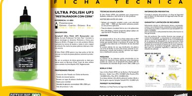 Symplex® Ultra Polish UP3 Restaurador con cera. Formula profsional "Un solo paso". Contiene la ultima tecnología en abrasivos, Polimeros y Ceras, para Restaurar, Brillar y Proteger en un solo producto. Elimina realmente las marcas de lavados y realza el color original del vehículo. No mancha piezas plásticas ideal para colores oscuros.