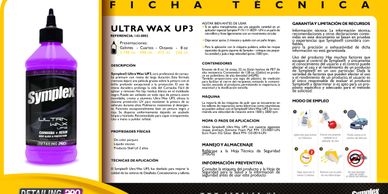 Symplex® Ultra Wax UP3, cera profesionala de carnauba premium con resina de larga duración. Esta formula cremosa dejará una película gruesa sobre la pintura con el brillo profundo excepcional y la protección. El uso de resina duradera prolonga la vida del Carnauba.